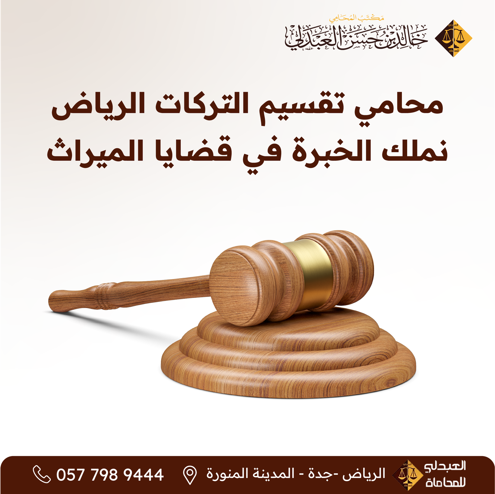 محامي تقسيم تركات في الرياض، محامي نزاعات الورثة، حل خلافات الورثة، تقسيم الورث، القسمة الرضائية، حصر الورثة، توزيع التركة شرعًا، تصفية التركات، نزاع على الوصية، شركات عائلية بعد الوفاة، فصل الشركاء بعد الوفاة، تقسيم ملكية العقارات بين الورثة، تقييم تركة، محامي تركات العبدلي للمحاماة الرياض، استشارة تركة عاجلة 0577989444، تحكيم أسري، وسيط ورثة، صك حصر الورثة، حصة الزوجة في الميراث، حصة الأبناء في الميراث، تقسيم منشأة عائلية بين الورثة.